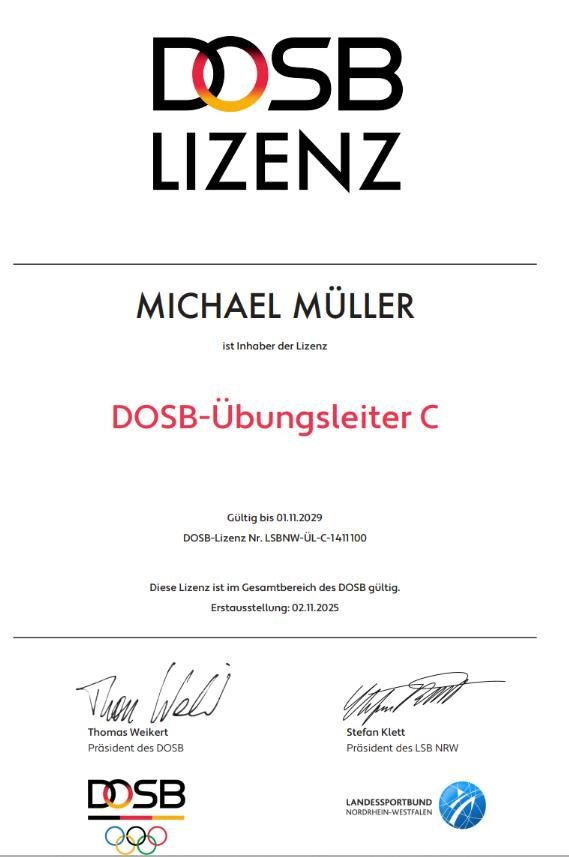 Ich habe seit letztem Jahr die Übungsleiter-Lizenz vom Landessportbund NRW.